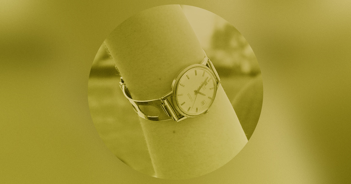 Und dann liegt direkt an der Kassa ein Schmucktablett, oberflächliches Drüberscannen, Ketten, Ringe, gähn. Uhr. Uhr! UHR! Analoges Perlmuttzifferblatt, Striche statt Ziffern, Sekundenzeiger, Datumsfeld. Automatik. Gold mit goldenem Metallband. Ein Herrenmodell, wie es mein Opa getragen hätte, wär er nicht der Silbertyp gewesen. Man fragt um den Preis, es stellt sich heraus, es gibt noch keinen, die eine Schwester, die im Laden heute fürs Auspreisen zuständig ist, sagt „25 Euro“. Gekauft. Die Uhr wandert in meine Tasche. Beim Rausgehen sieht man die andere Schwester, die sich bei Uhren auskennt, mit der einen reden und heftig gestikulieren und dann resigniert mit den Schultern zucken. Man weiß, es war ein guter Kauf.